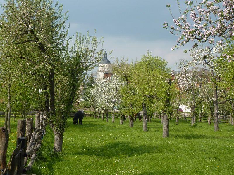 Mit Blick auf den Barbyer Kirchturm genießen Sie vom Frühjahr mit blühenden Bäumen bis hin zum goldenen Oktober ländliches Flair mit allem Komfort.